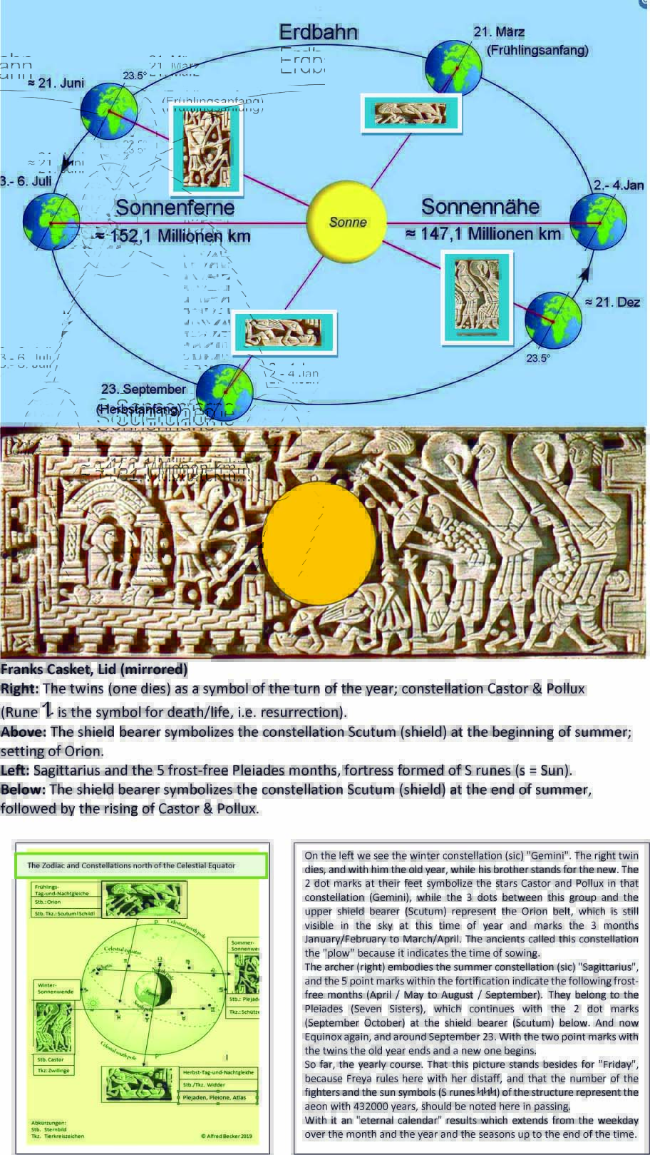 Noch einen kurzen Rückblick und dann den Ausblick: Links sehen wir das Wintersternbild (sic) „Zwillinge“. Der rechte stirbt, und mit ihm das alte Jahr, sein Bruder steht für das neue. - Wintersonnenwende - Die 2 Punktmarken zu deren Füßen stehen für die Sterne Castor und Pollux in jenem Sternbild (Gemini), während die 3 Punkte zwischen dieser Gruppe und dem Schild (Scutum) den Oriongürtel darstellen, der noch zu dieser Jahreszeit am Himmel steht und die 3 Monate Januar/Februar bis März/April symbolisiert. Die Altvorderen nannte diese Konstellation „Pflug“, da sie die Zeit der Aussaat anzeigt.